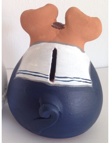Hucha cerdito realizada en arcilla roja, decoradas como el niño que hace la Primera Comunión. Modelo con tapón.
