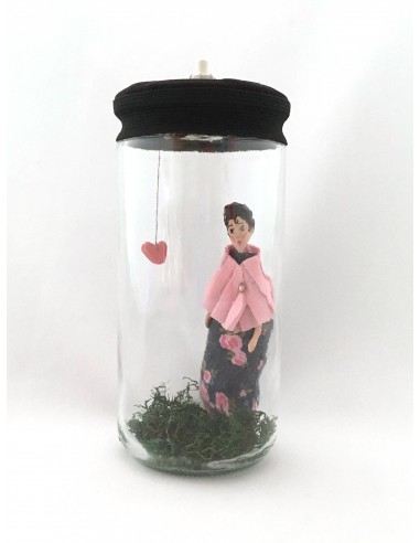 Se trata de una figurita modelada a mano, vestida con bonitos estampados, con muchos minúsculos detalles, colocada en un bote de cristal con tapadera y con un dispositivo de luz led, de lo más original. Una escultura iluminada que lucirá genial en cualquier rincón de la casa, estantería o en mesillas de noche...