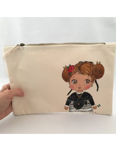 Práctica como bolso de mano, bolsa auxiliar, estuche, neceser... 100% algodón. Medidas: L: 28 x 20 cm. Es multipropósito y posee cremallera metálica vintage dorada.
